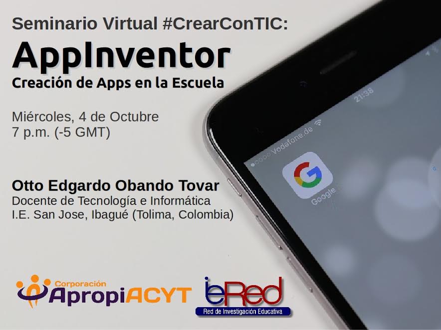 El próximo miércoles 4 de octubre, a las 7 p.m. se realizará la tercera sesión del ciclo de presentaciones del Seminario Virtual #CrearConTIC, que en esta oportunidad contará con la participación de Otto Edgardo Obando Tovar, docente de la I.E. San José de Ibagué (Tolima, Colombia).El tema en esta oportunidad será el uso de AppInventor en la Escuela. Este seminario es abierto y gratuito, el cuál se puede seguir a través de la siguiente Página: http://apropiacyt.org/crearcontic/ Quienes ya se encuentran inscritos, sólo deben ingresar al chat y participar con sus preguntas o comentarios para el ...
